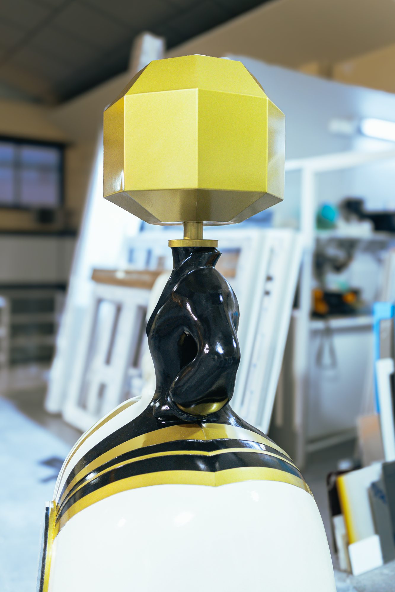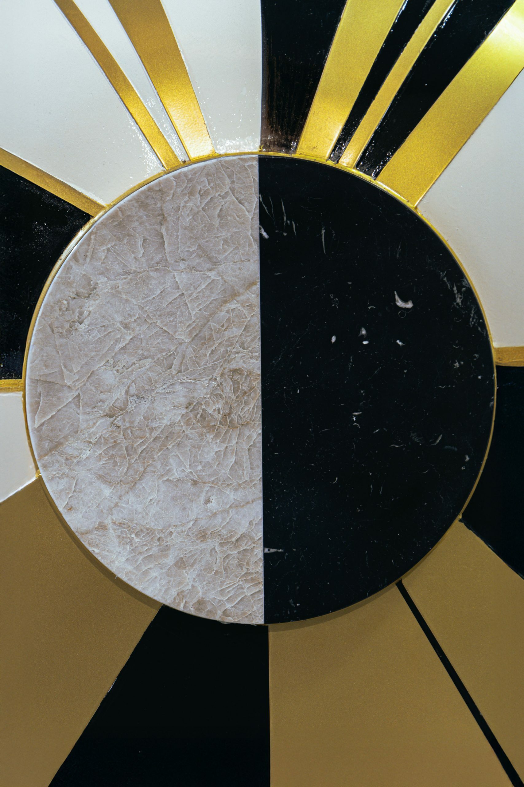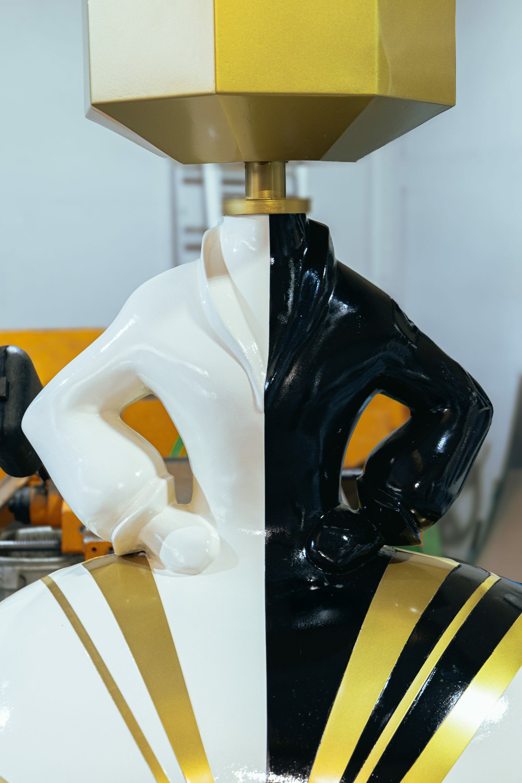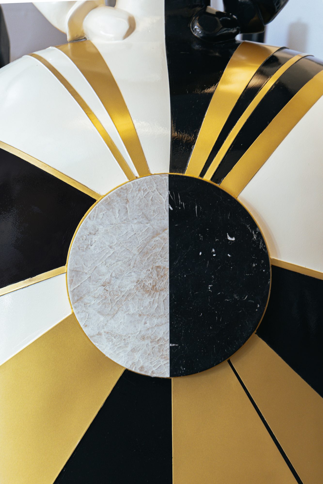 In the artwork, I used two types of marble, precisely divided to represent the exact moment of the eclipse. The head of the Menina—designed as the lamp’s shade—is made of iron lacquered in gold. The golden lacquered steel strips that embrace the figure introduce subtle sparkles, reminding us that light always finds a way to reveal itself.