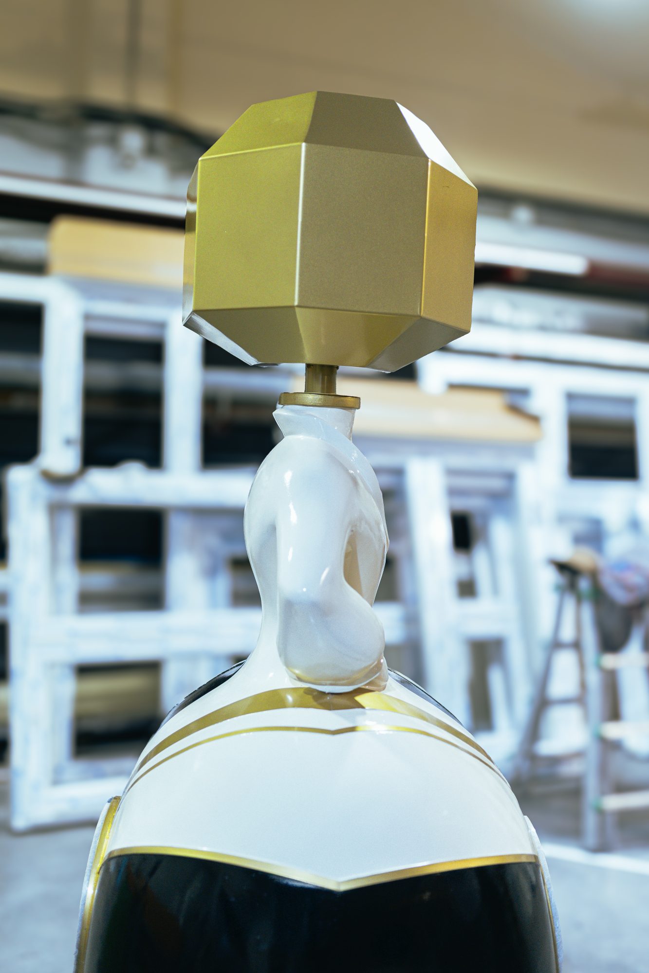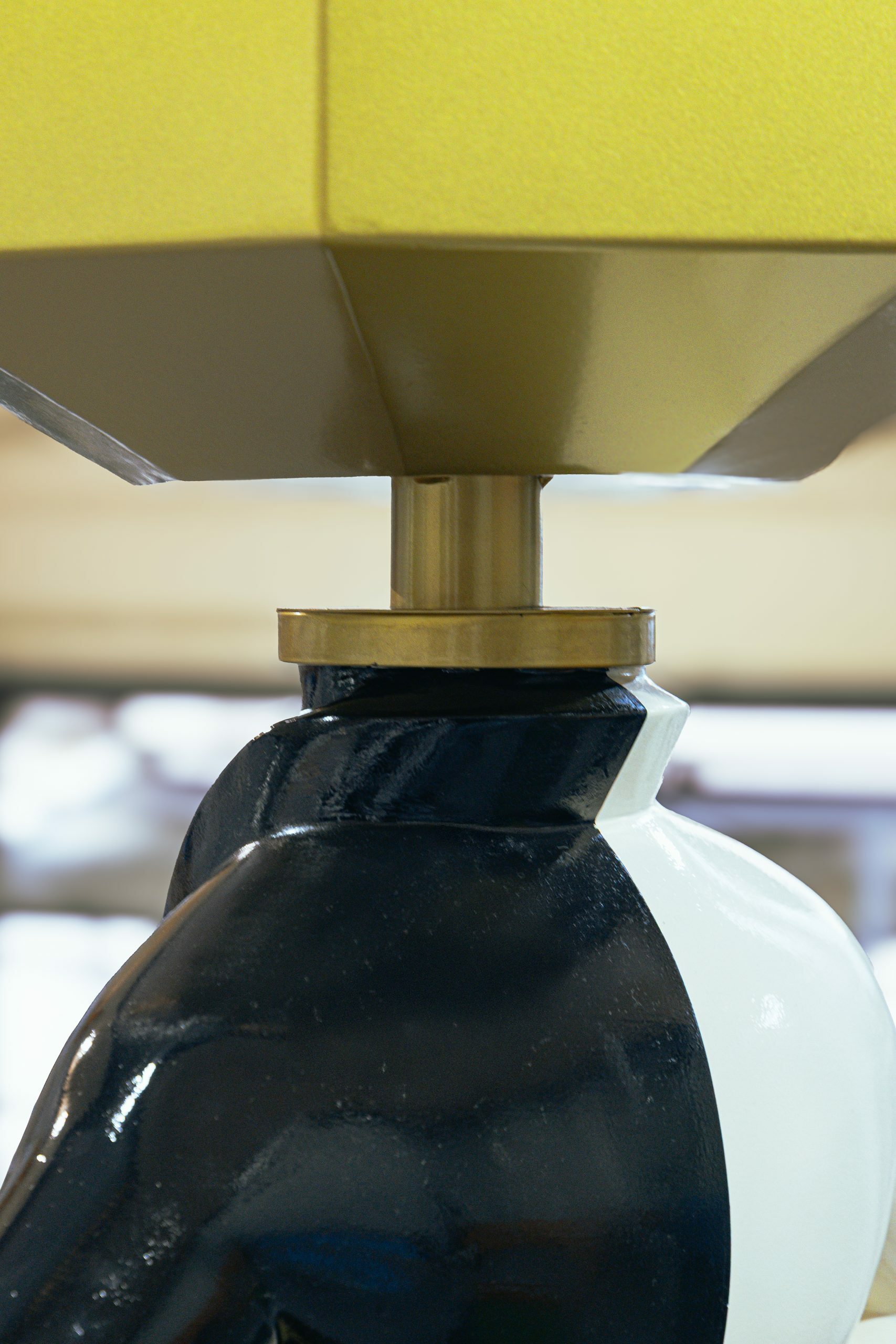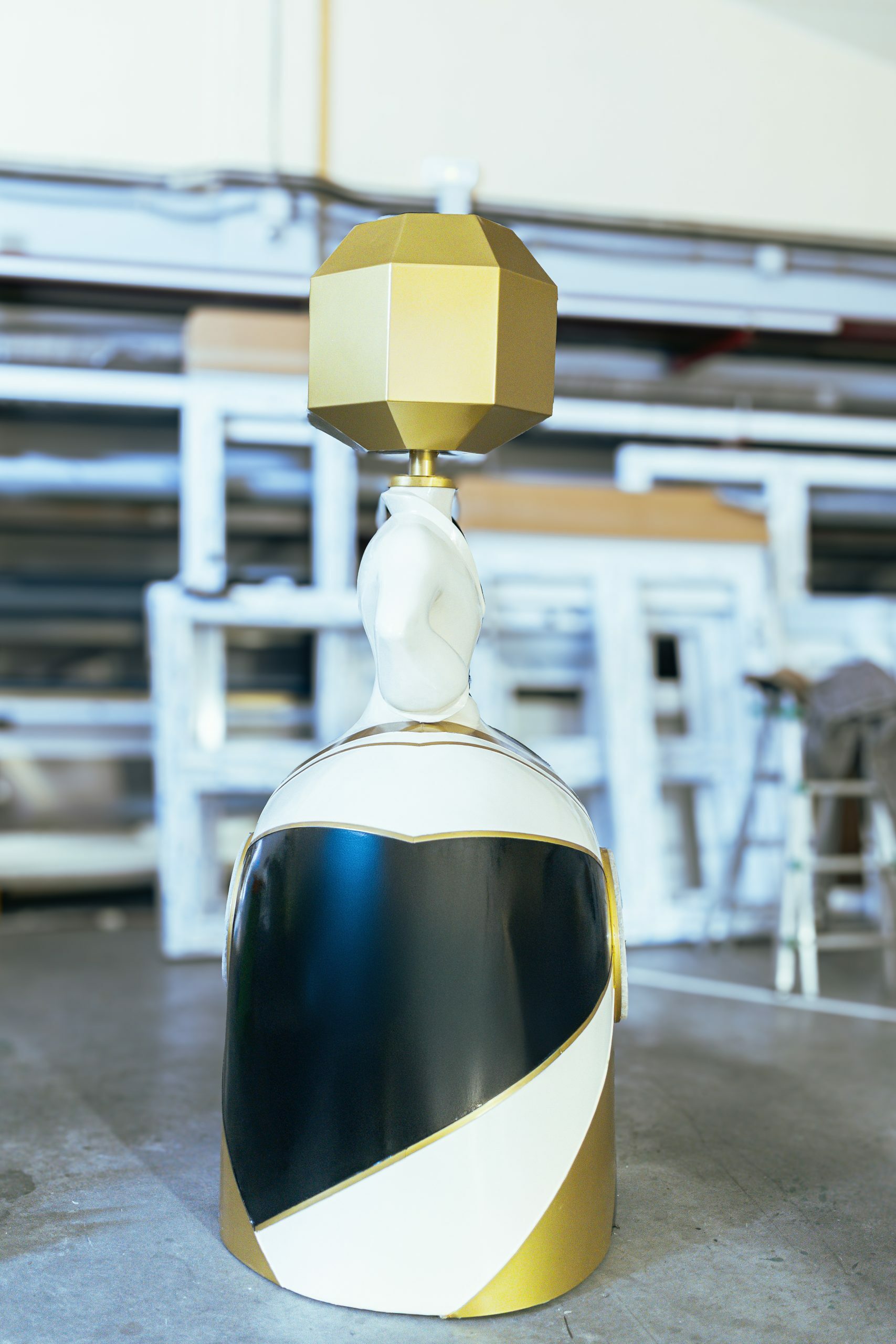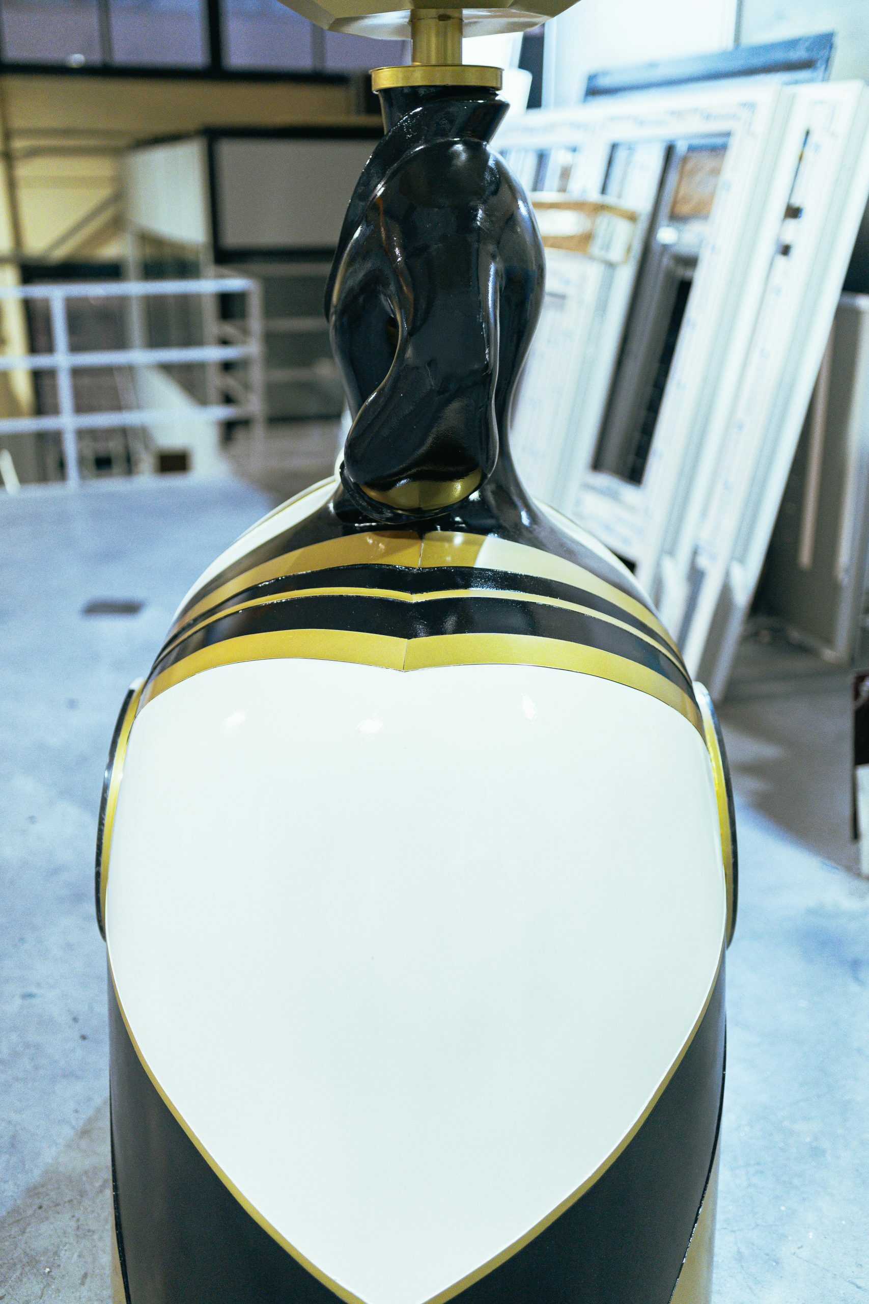 In the artwork, I used two types of marble, precisely divided to represent the exact moment of the eclipse. The head of the Menina—designed as the lamp’s shade—is made of iron lacquered in gold. The golden lacquered steel strips that embrace the figure introduce subtle sparkles, reminding us that light always finds a way to reveal itself.